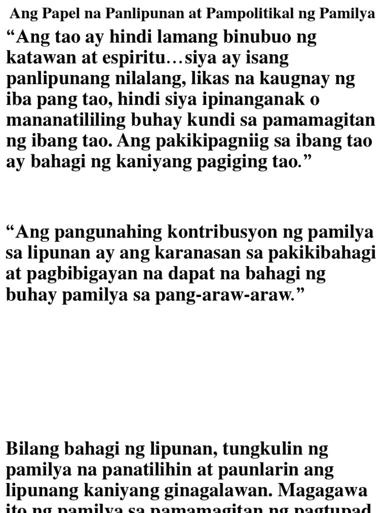Hindi maisusulong at mapoprotektahan ang mga karapatan at tungkulin ng pamilya kung hindi nito alam kung anu-ano ang karapatan at tungkulin nito. Ang pamilya ay isa sa mga pinakamahalagang sangay ng lipunan. Ang pakikipagniig sa ibang tao ay bahagi ng kanyang pagiging tao 3.