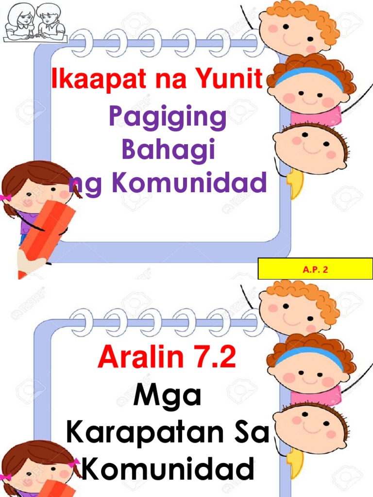 Ang mga batang pilipino ay may mga karapatan. Ito ay kanilang ginagampanan para sa ikabubuti at ikauunlad ng ating bansa. Pagtukoy sa bumubuo ng komunidad at ang papel at tungkulin ng bawat isa.