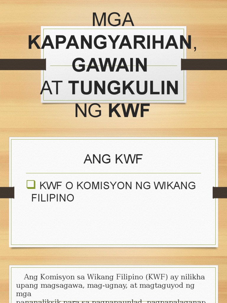 Tungkulin ng KWF ang ganyakin at itaguyod sa pamamagitan ng sistema ng mga insentibo mga. Pero abala buong taon ang Komisyon sa Wikang Filipino KWF sa tungkulin nitong paunlarin ng wikang Filipino. Ortograpiya Ito ay ang representasyon ng mga tunog ng wika na nakalimbag na mga simbolo tulad ng alpabeto.